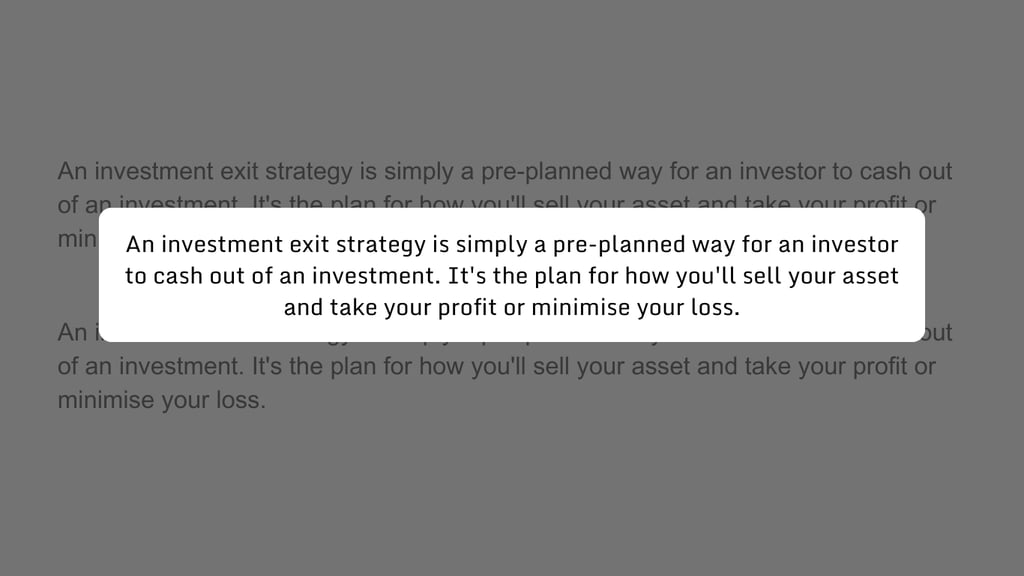 An exit strategy is simply a pre-planned way for an investor to cash out of an investment. It's the plan for how you'll sell your asset and take your profit or minimise your loss.